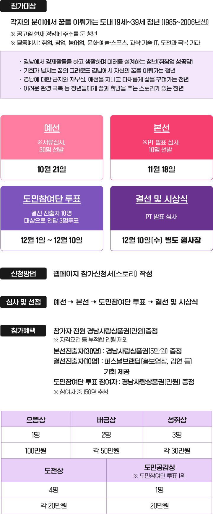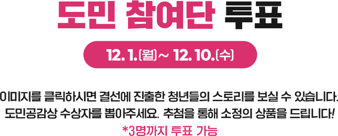 본인은 경상남도가 추진하는 경남 청년 스토리 콘테스트 결선진출자 인기투표 이벤트와 관련하여 아래와 같이 본인 개인정보의 수집·이용 및 제3자 제공에 동의합니다.